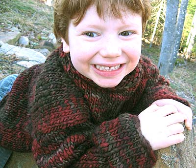 A lovely roll neck in deep, garnet flavored cranberry, melded with a beautiful tree/forest green - it looks brown in this photo, but it's really a lush forest green. This yarn goes from hue to hue, creating a wearable canvas of color. Pull it up around their chins when they fall asleep, roll up their sleeves when you find a good puddle - this sweater is a working luxury sweater. Just gorgeous.